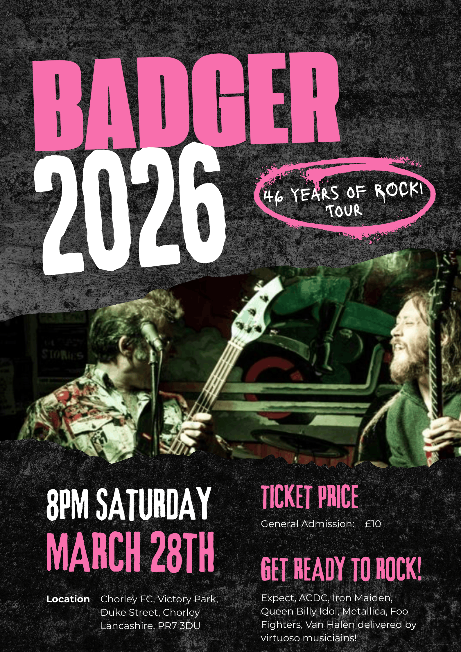 Badger are one of the finest rock covers bands you are likely to see. Now in their 46th year of touring with their sets featuring classic tracks from ACDC, Iron Maiden, Queen, Metallica, Foo Fighters, Jimi Hendrix and many more. Fantastic musicians who will be rocking Chorley FC on 28th March. Tickets now on sale here for only £10!